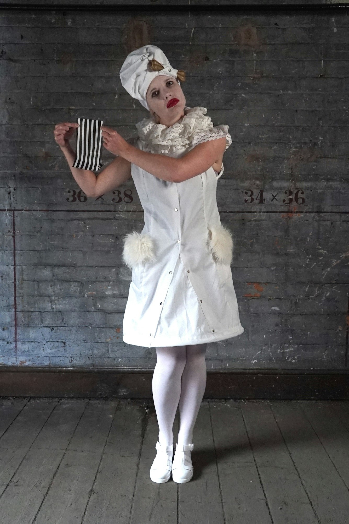 I constructed the costume from a white lab coat. This linked well to the aspects of eugenics discussed in the piece and gave a bizarre combination of science, health and fashion to which issues surrounding pedigree dogs are entangled.