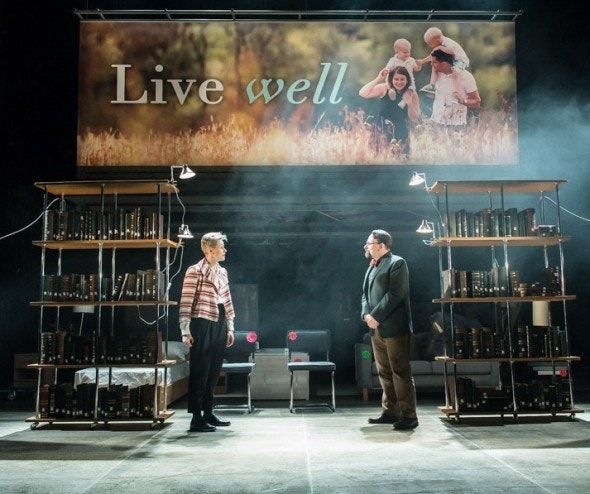 The set was less dramatic than I expected. The large backdrop signs less dominating than I expected as they loomed overhead when we visited the stage. I expected the stage to really transform and yet it stayed largely the same with more subtle differences. The random collection of furniture was largely annoying and totally useless. I found myself increasingly wondering when the mannequin's for example would be used and they just weren't. I understand this design decision probably represented something about our consumerist culture but they just looked a bit messy and had no performative purpose. The bookshelves I liked and feel these should have been used more and in more unusual ways.