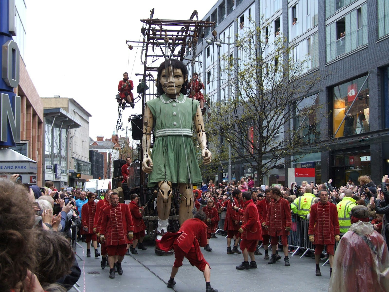 bodily engagement with this performance in relation to affordances. The objects themselves, the way they are held (mechanisms) enslaved, relationship with operators, tending to them. giants have there own action and life. the way they have been crafted - choice of materials e,g, hair offers independent movement. scale is interesting. makes you look around at the city in different ways. the audience they attract, people standing back, moving like a kind of tide through the city. the layout of the street and the buildings these giants pass are important. all part of this event, see city in new light. relational pull, intentional arc how it worked on audience.