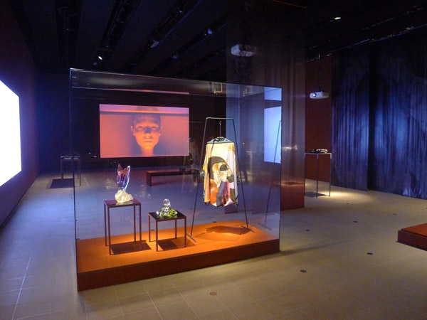 The stand out piece of the exhibition by a long way, was the installation by Lindsay Seers entitled Nowhere Less Now, this huge boat inspired structure was from the outside impressive and dominating in the space and a real experience within. On entering each person was given headphones and guided by an attendant with a torch, up a platform, to a seat and told to plug in their headphones. In front of the raised audience were two suspended projection screens, one a huge perfect sphere and directly above like a mirror, a convex circle. The projection mapping on these screens was perfectly matched, making them come to life as objects and really create a sense of a 3D image. At one point they became spinning moons and the realism in their image and suspended form, was magical. The story was Verbatim, featuring the artist and her memories and relationship with her father and both their struggles with schizophrenia. It became apparent that this split personality disorder was what the two screens represented, they appeared to mirror each other in style and position but often differed in image. Complementing or contrasting each other, working together, fluid, or working apart. The soundtrack was also beautiful and powerful, often featuring strange but intense cello lines, manipulated by digital effects, beautiful and haunting. Similarly the artists voice was compelling to listen to and her story an intriguing mix of past and present. The images presented included a mix of historical footage and generated material, often featuring the artist dressed in quite oppressive make up, reminiscent of vaudeville theatre. I stayed and watched this piece for two runs compelled by the imagery, environment and story. I loved how this installation triggered the senses through the immersive world it created and the quality of skill and delivery.