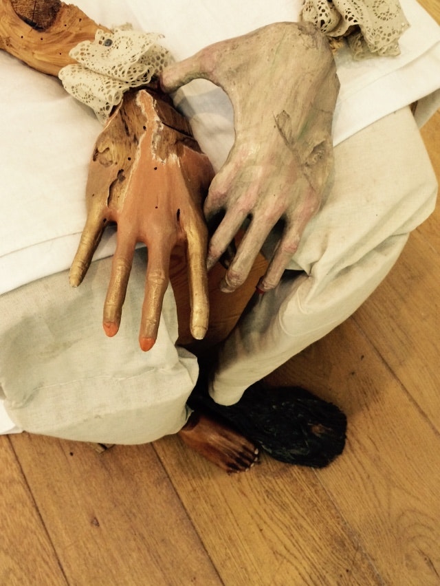 Malinche was a Mexican woman given to the Spanish 1519, who played a role in the Spanish conquest of the Aztec empire. The sculptural figure was cleverly placed looking directly at the door to face you as you enter. It was of a primitive folk in style, which at first glance might sit well in a museum and yet on closer inspection was infact a mixture of the old and new. On the clothes rail type stand a was modern bra, against the natural colour palette brightly coloured plastic beads. There was also a mix of nature and man-made with tree branch back but man made shoulders, a carved foot and a bark foot, snake skin face to one side, skin to the other. Her deep glistening eyes, draw in an audience and the reflective quality catches the light to give both life and a teary sadness. The joints of the figure are like those of a puppet but motionless, but with that there seems a potential for movement at any time.