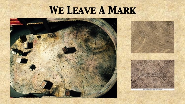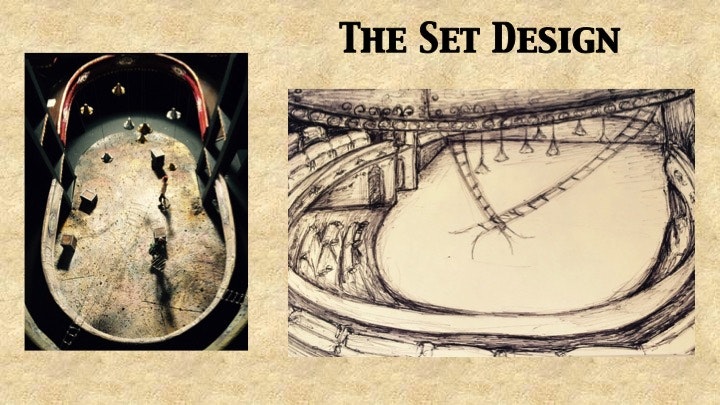 The floor is highly textured and painted with a surface that can be scrapped and changed showing the marks we all make and a constantly shifting surface. The design for this was inspired by the tracks left on fields by a mass of people, objects and vehicles after a festival or fair. Circular tracks in particular represented the carousel style rides and the circular notion of the narrative. The floor is a large expanse, seen clearly by all in the theatre, with some even encouraged to walk across to find there seats. The floor represents the notion of leaving our mark on the world and yet most will dissolve through time.