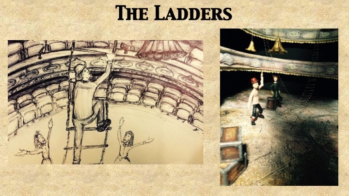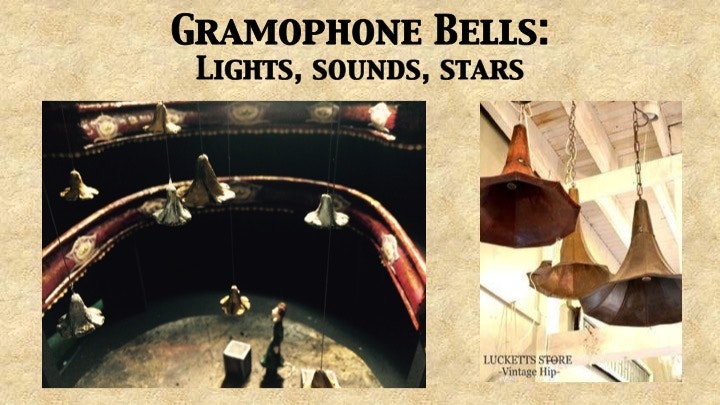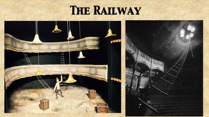 The existing auditorium would play the role of the fairground. The mirrored, on stage auditorium would play Heaven and the central area of the stage would transform easily to represent other locations on earth. This central area would feature packing boxes, which could be stacked and moved to form the different settings and staging requirements. Other key design features, which would stay constant throughout, would be the delicate metal ladders representing the railway line on earth and the stairs to heaven/purgatory. Hung centrally are a collection of gramophone bells, pulling the space together, and representing stars in heaven and the carousel organ on earth. This was a key design metaphor and focus for the character of Liliom.