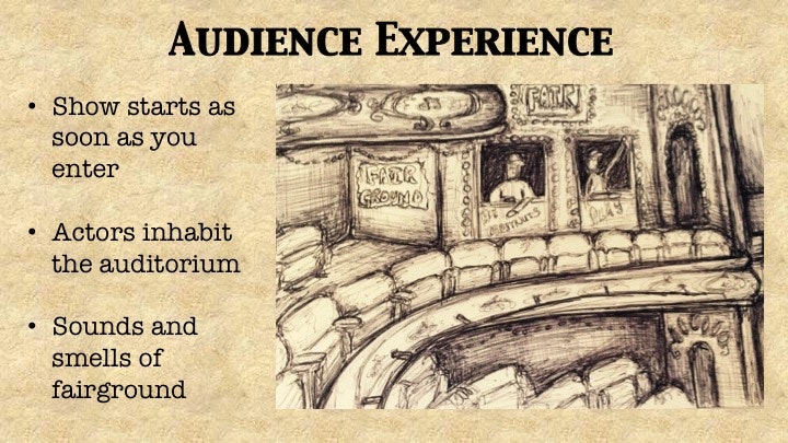 We wanted to work with the existing building features, such as the decorative balconies and ironwork inner structure. These could be exaggerated and enhanced adding paintwork and lights inspired by traditional carousels. The balconies would then be mirrored onto the stage to create a circular feel to the space. The opening sequence would particularly utilise this circular auditorium setting, giving the feel of a fairground and through lights the motion of the turning carousel.