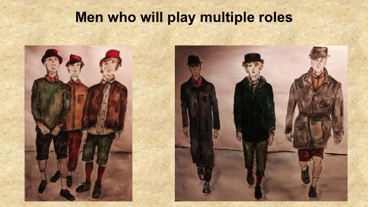 Characterisation and flexibility was important within the costume designs. Each character represented its own struggles, development and duality. Each actor needed to transform either between characters or through time. Therefore each had a basic costume, which could be enhanced with simple additions or changes such as the addition of a coat, the placement of a hat or the change in trouser length. The styles were inspired by contemporary haut couture catwalk fashion and aimed to give the play a contemporary setting while harking back to some hints of early 19th Century styles. It was important that this play could be seen as relevant to a modern audience and current through the immersive action. Yet many of the issues explored are timeless and the repetitive and continuous motion of life and death, earth and heaven are endless.